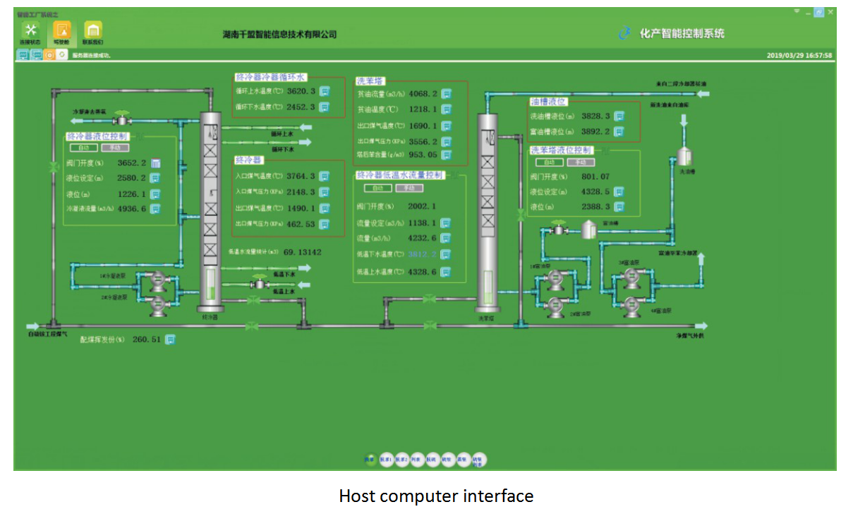 On the basis of intelligent control platform of coking integration, the system consists of desulfuration subsystem, ammonium sulfate and ammonia stilling subsystem, crude benzene subsystem, and underlying device control subsystem, which takes control of key parameters and predicts them intelligently, and provides interlocking operation and status diagnosis to underlying devices. By coordination and optimization, the system is able to take control of underlying devices and process automatically and stably ,and make top management coordination optimized , so as to improve production, reduce costs and raise the standard of management.