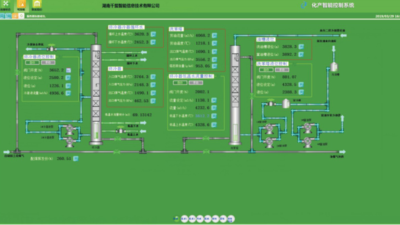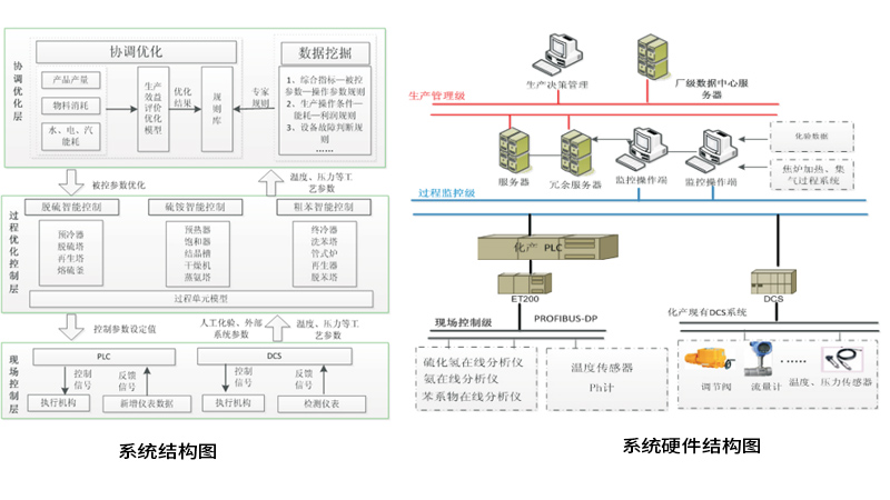 本系統(tǒng)從焦化一體化智能控制平臺出發(fā),主要包含脫硫子 系統(tǒng)、硫銨與蒸氨子系統(tǒng)、粗苯子系統(tǒng)及底層設備控制子系統(tǒng), 對關鍵參數(shù)進行智能預測與控制,對底層設備進行聯(lián)鎖操作與 狀態(tài)診斷,通過協(xié)調優(yōu)化,實現(xiàn)底層設備自動控制、過程環(huán)節(jié) 穩(wěn)定控制、上層管理協(xié)調優(yōu)化,達到優(yōu)化生產過程、降低成本、提高管理水平的目的。