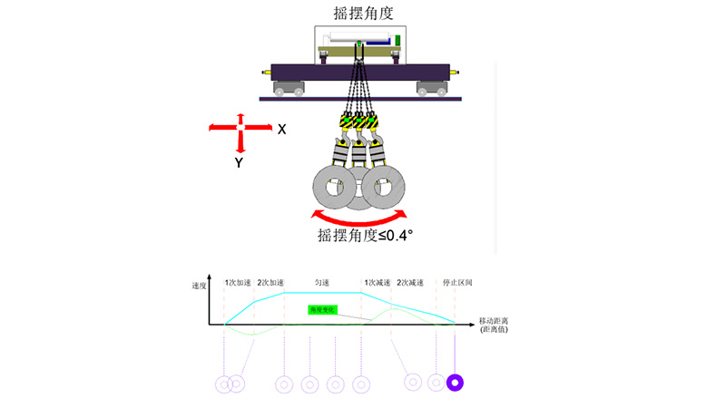 天車在變速運(yùn)動中主鉤速度變化會滯后于大車和小車的速度變化,不可避免的會發(fā)生主鉤晃動的情況,這給天車的安全運(yùn)行帶來了風(fēng)險,為了消除這種速度變化不同步帶來的角度搖擺,讓天車在最短的時間內(nèi)平穩(wěn)的達(dá)到目標(biāo)位置,天車系統(tǒng)的設(shè)計中需加入防搖擺控制技術(shù)。