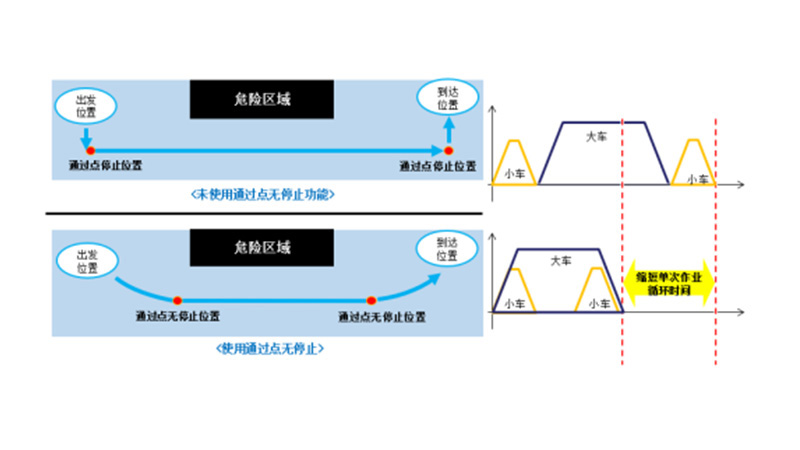 采用智能路徑?jīng)Q策算法,在避開危險區(qū)域的同時選擇效率最高的行走路徑,可以無靜止通過路徑轉(zhuǎn)折點(diǎn),充分保證效率最高。