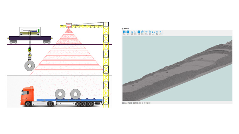 三維掃描是利用激光掃描、視覺成像、高精度云臺等技術(shù)獲取料堆或汽車的輪廓,生成物料的三維坐標(biāo),指導(dǎo)天車精準(zhǔn)作業(yè)。應(yīng)用場景有汽車掃描識別、料堆成像。
